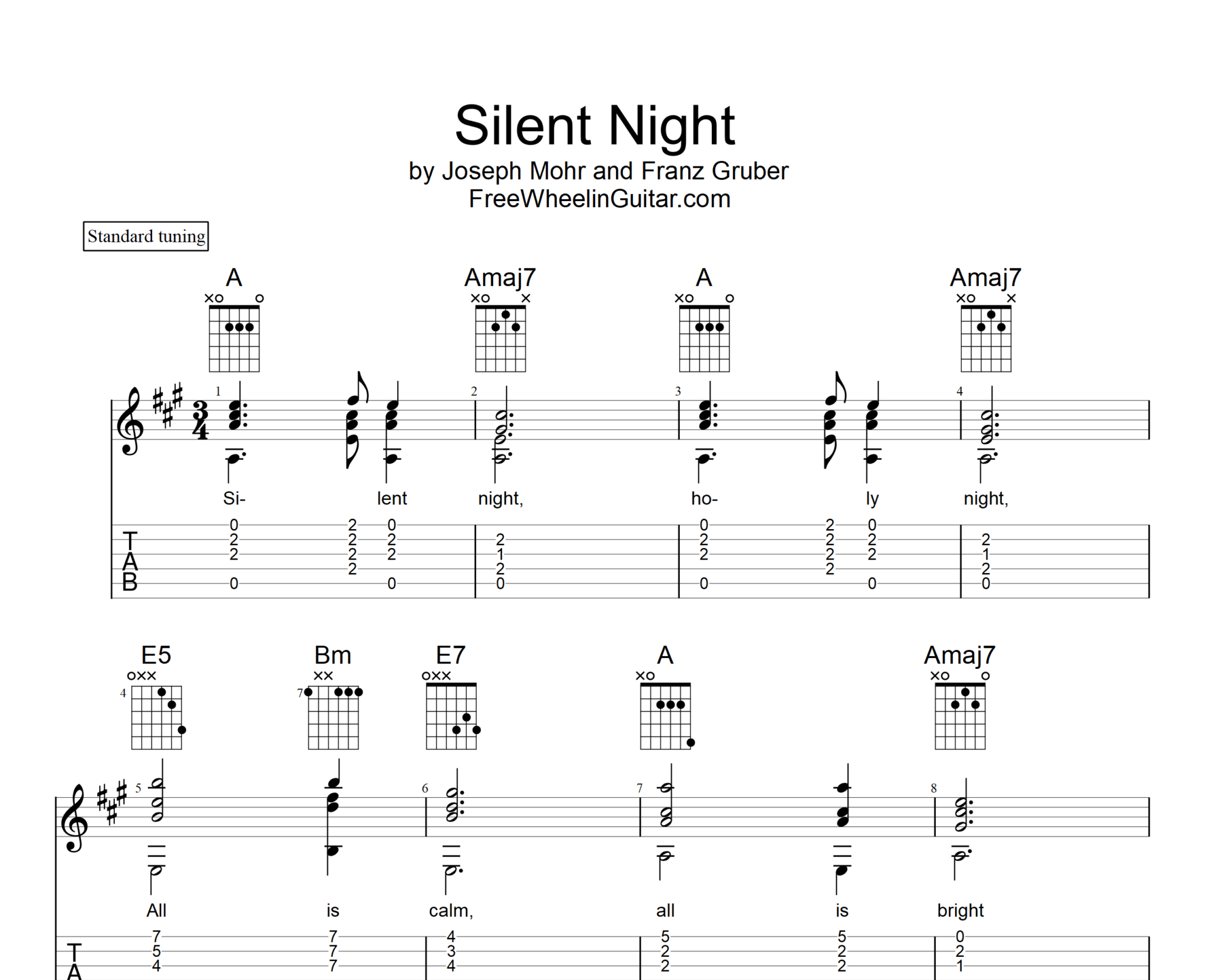“Silent Night” Solo Guitar Tab (2 Pages). Download as a PDF.